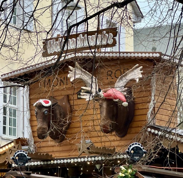 Der Glühweinstand mit den sprechenden Elchen befindet sich gleich hinter dem Konzertsaal des Stadtcasinos an der Fasnachtsgasse, in der Nähe des Neptunbrunnens.